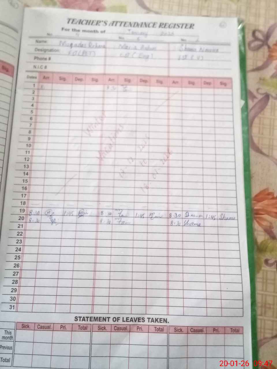 | CNIC | Full Name | Designation | R/C | Absence During Last Calender Month |