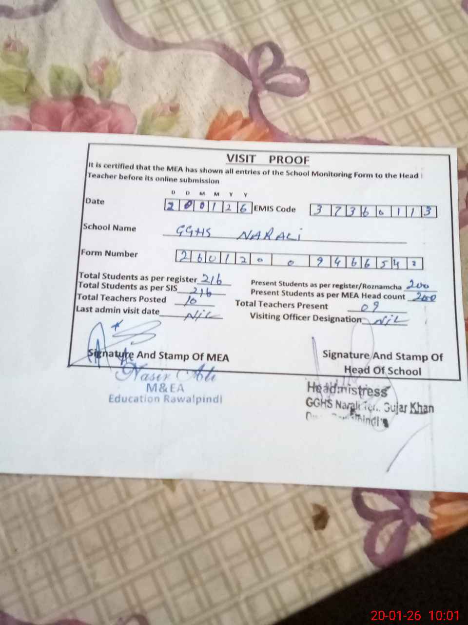 | Attendance Register | Head Teacher | MEA with School | Visit Proof |