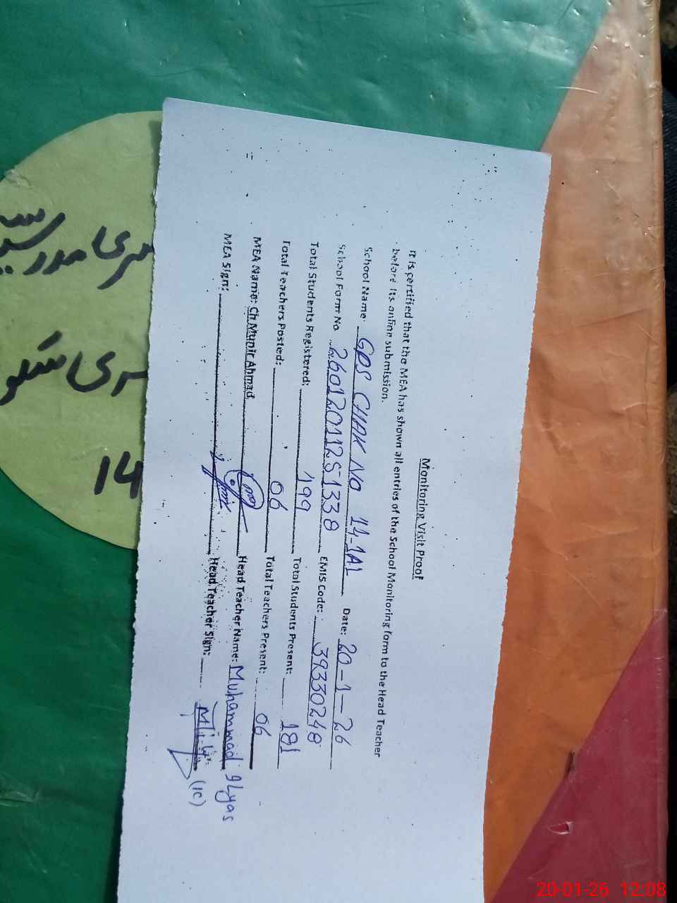 | Attendance Register | Head Teacher | MEA with School | Visit Proof |