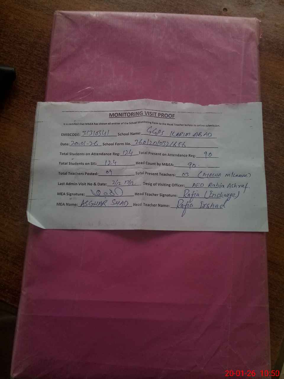 | Attendance Register | Head Teacher | MEA with School | Visit Proof |