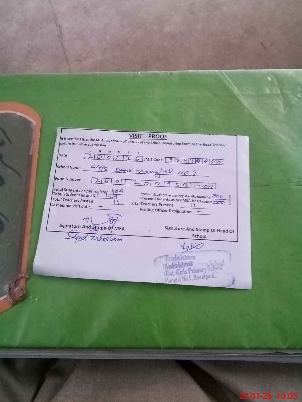 | Attendance Register | Head Teacher | MEA with School | Visit Proof |