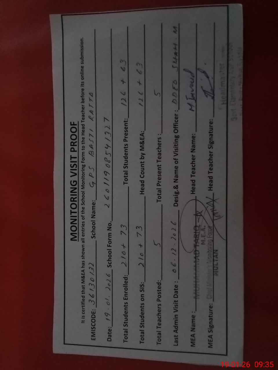 | Attendance Register | Head Teacher | MEA with School | Visit Proof |