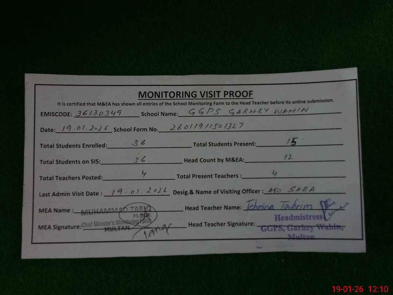 | Attendance Register | Head Teacher | MEA with School | Visit Proof |