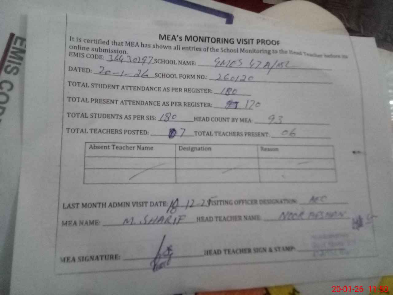 | Attendance Register | Head Teacher | MEA with School | Visit Proof |