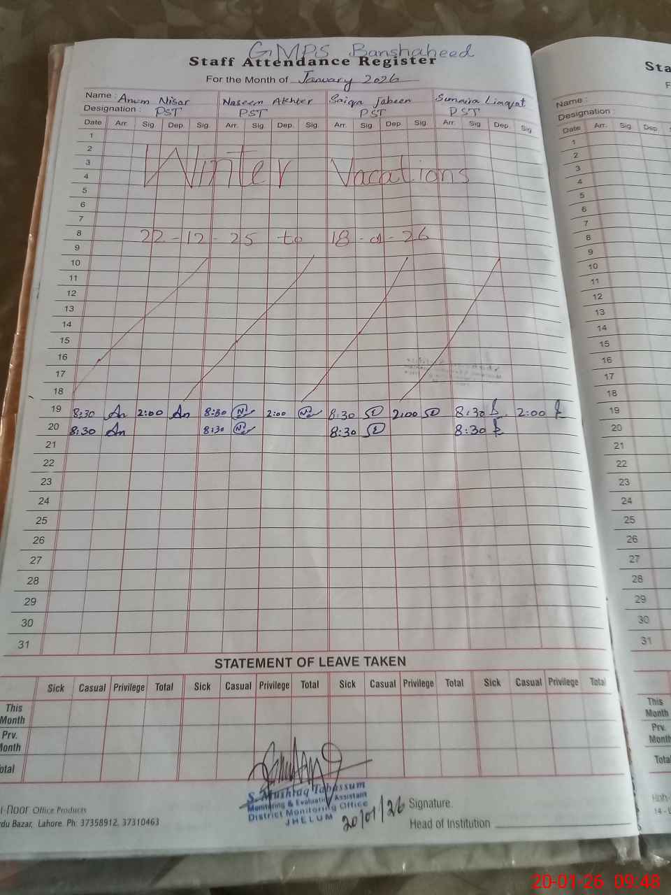 | Attendance Register | Head Teacher | MEA with School | Visit Proof |