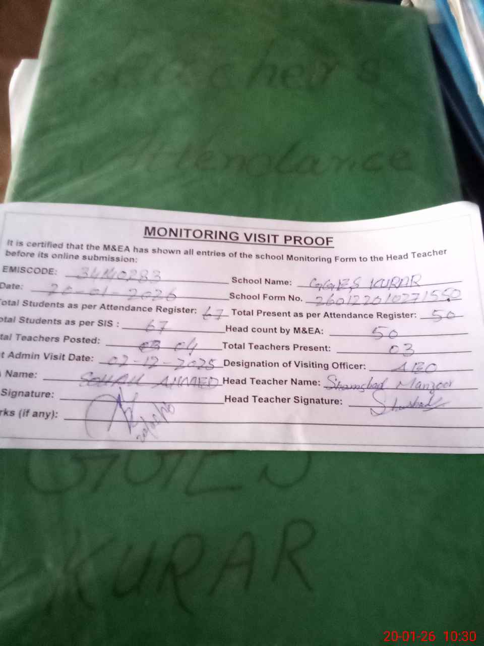| Attendance Register | Head Teacher | MEA with School | Visit Proof |