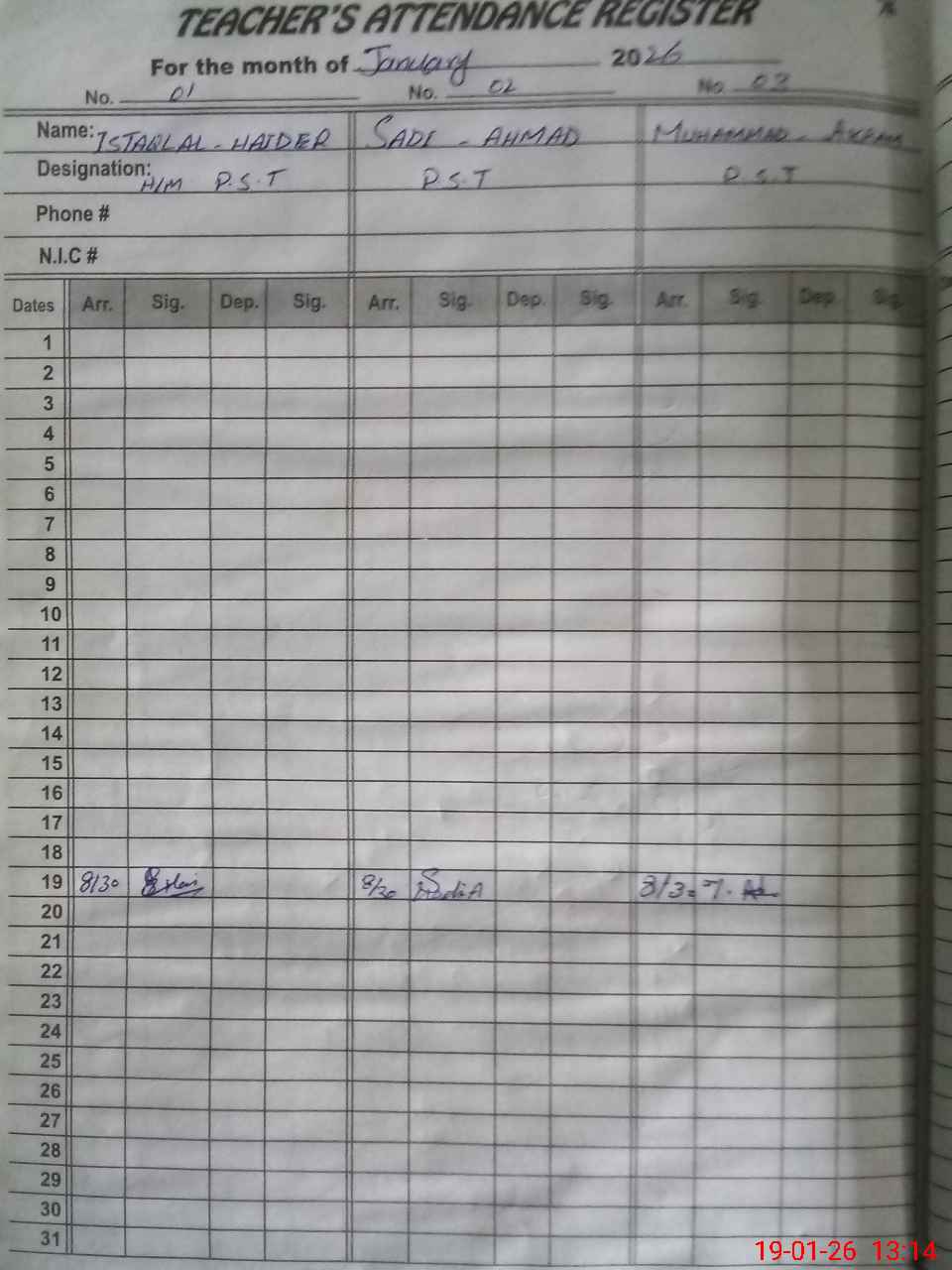 | CNIC | Full Name | Designation | R/C | Absence during last cal. month |