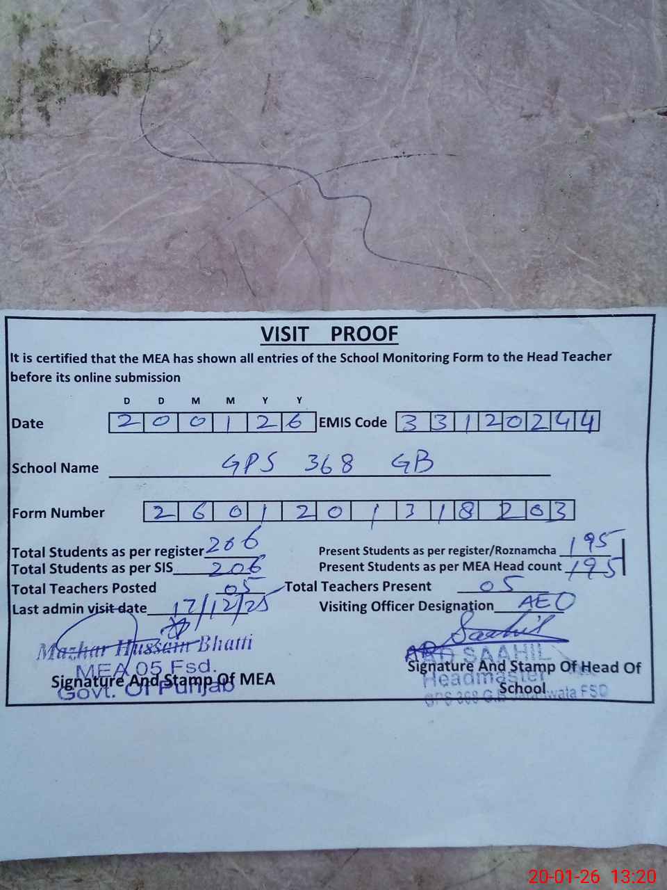 | Attendance Register | Head Teacher | MEA with School | Visit Proof |