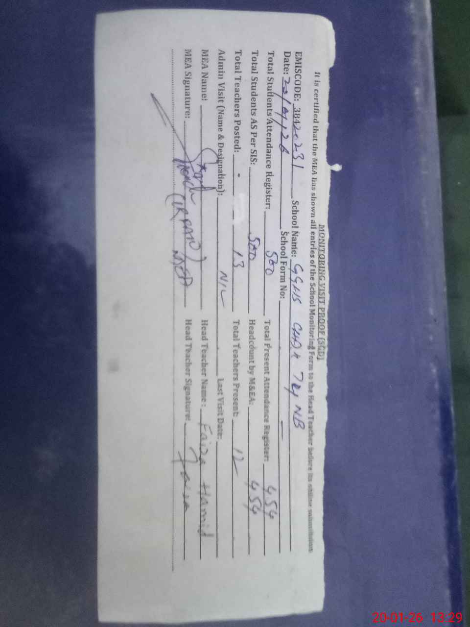 | Attendance Register | Head Teacher | MEA with School | Visit Proof |