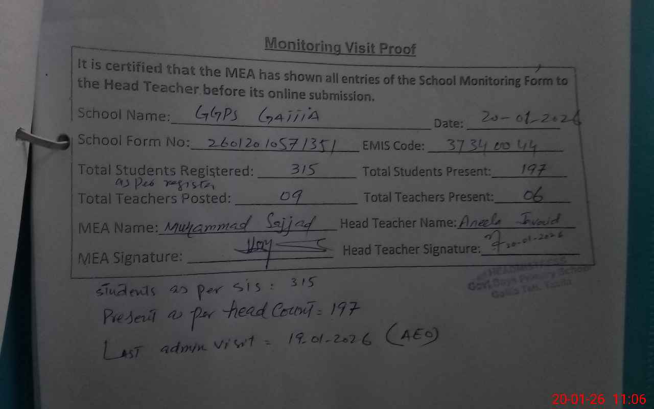 | Attendance Register | Head Teacher | MEA with School | Visit Proof |