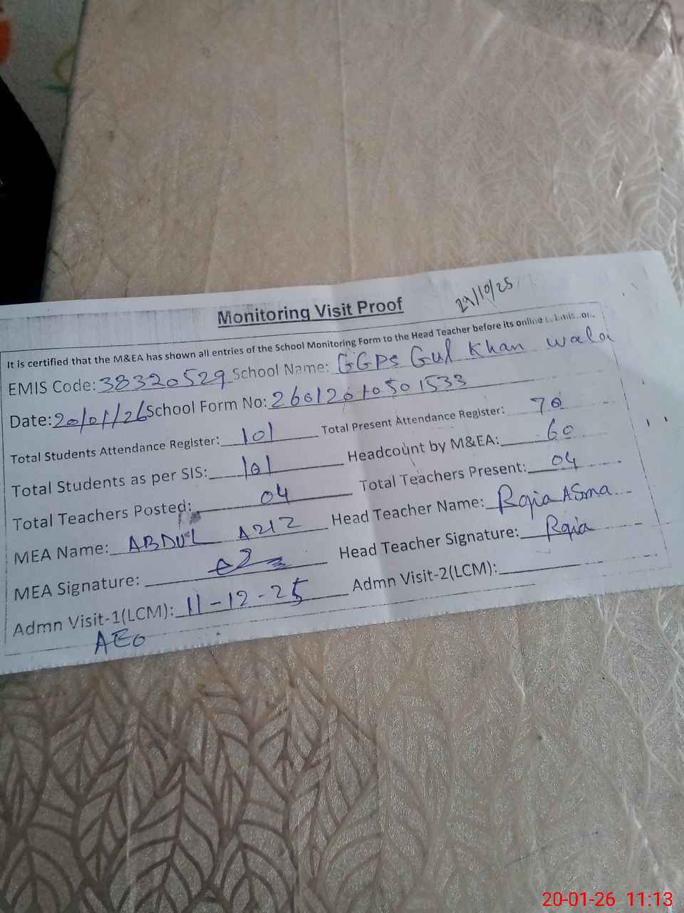 | EMIS Code: 38320529 | Name of School: GGPS GUL KHAN WALA | |||