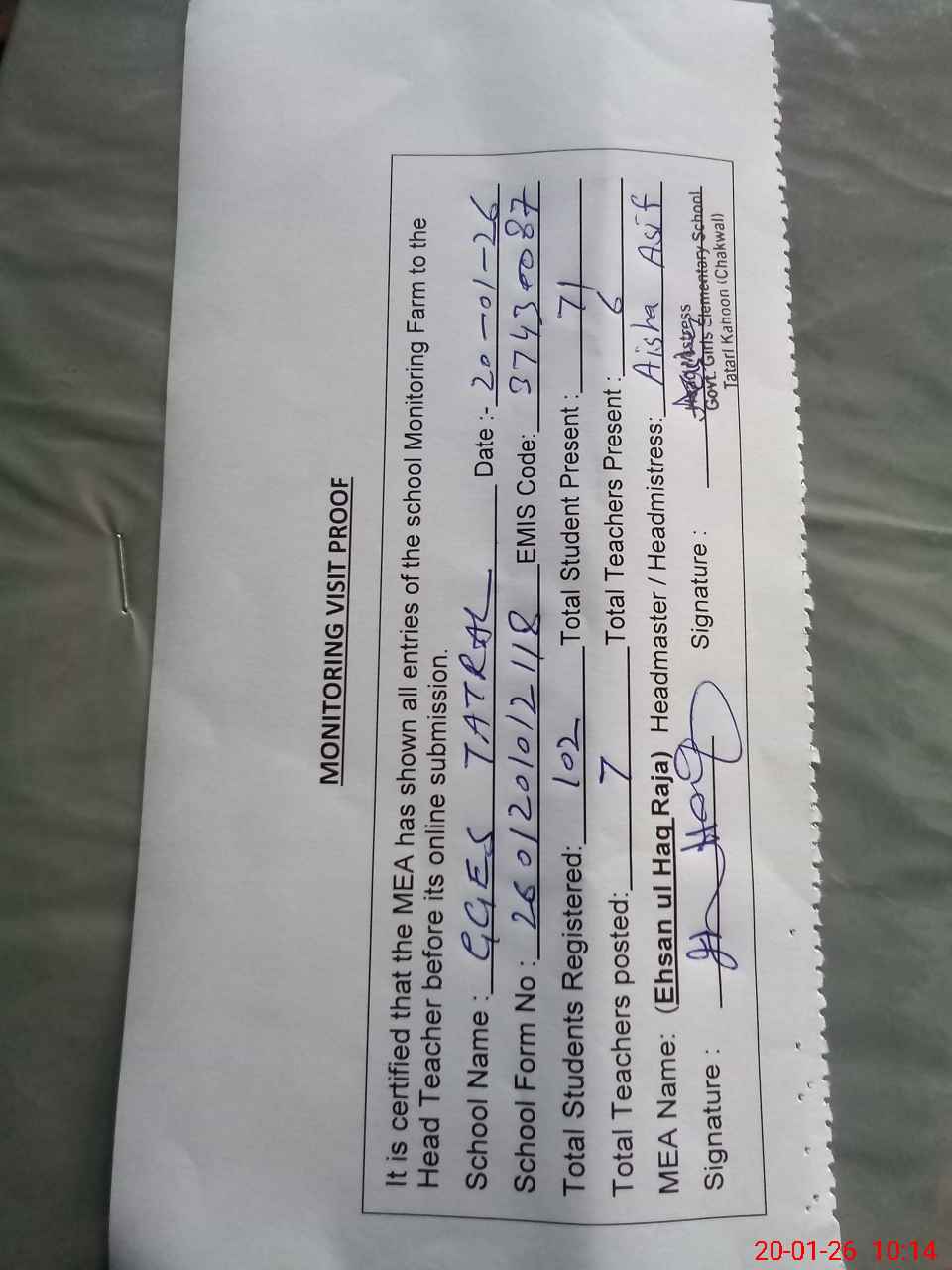 | Attendance Register | Head Teacher | MEA with School | Visit Proof |