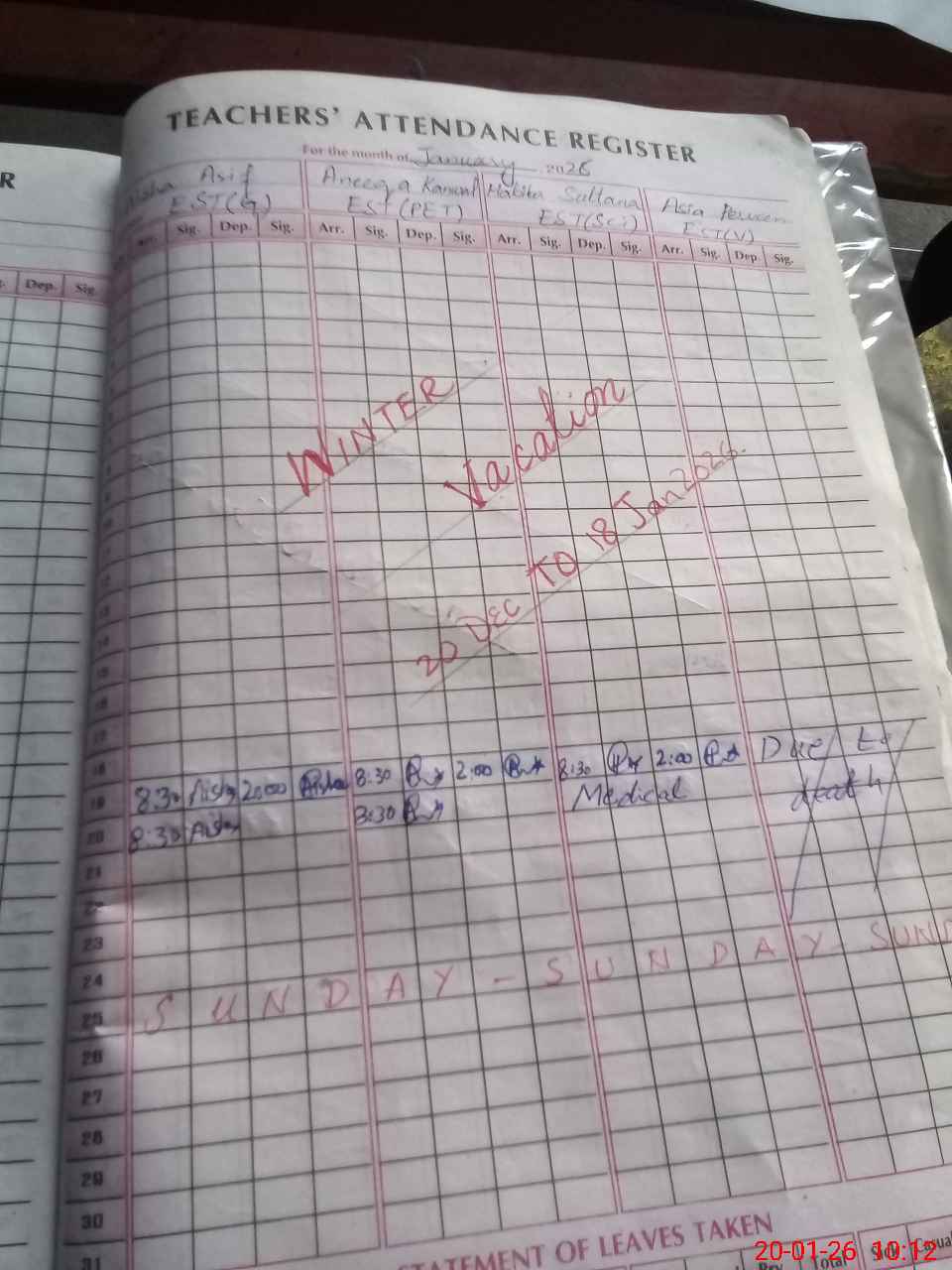 | Leave | Duty | Absent | Maternity | Medical | Ex- Pak |