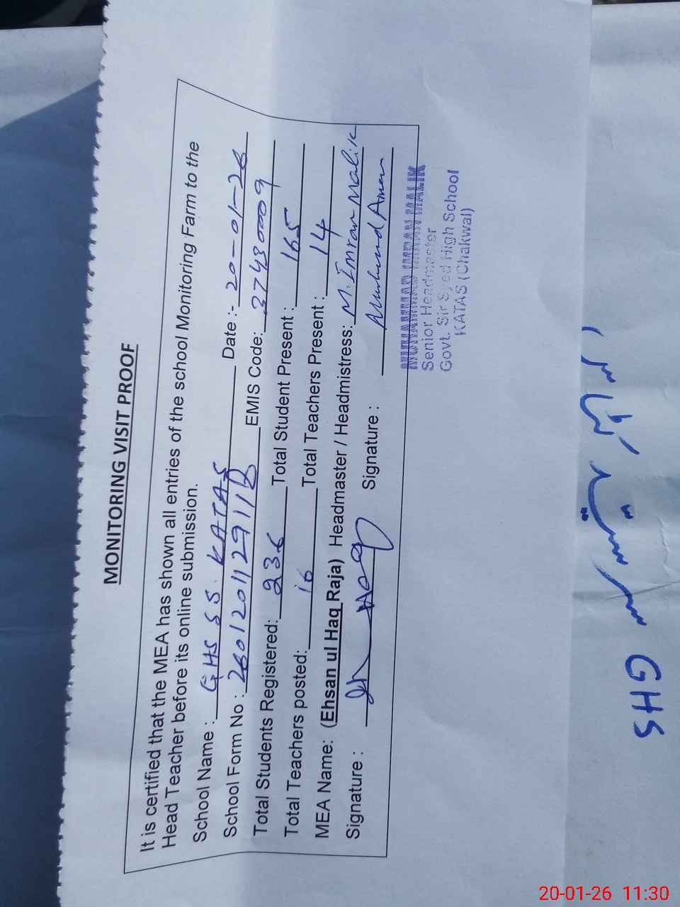 | EMIS Code: 37430009 | Name of School: GHS SIR SYED KATAS | |||