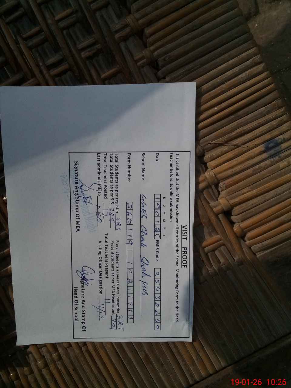 | Attendance Register | Head Teacher | MEA with School | Visit Proof |