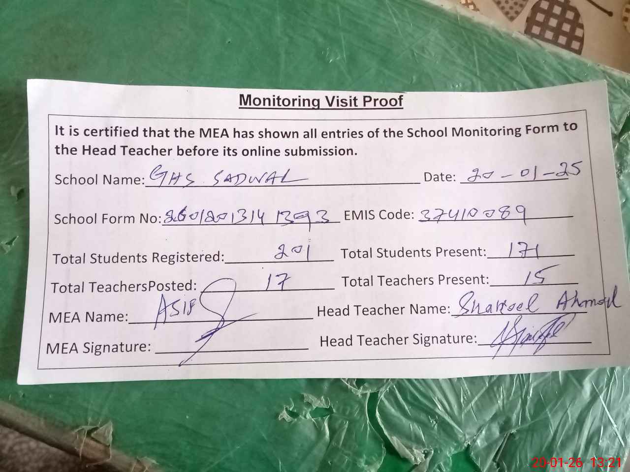 | Attendance Register | Head Teacher | MEA with School | Visit Proof |