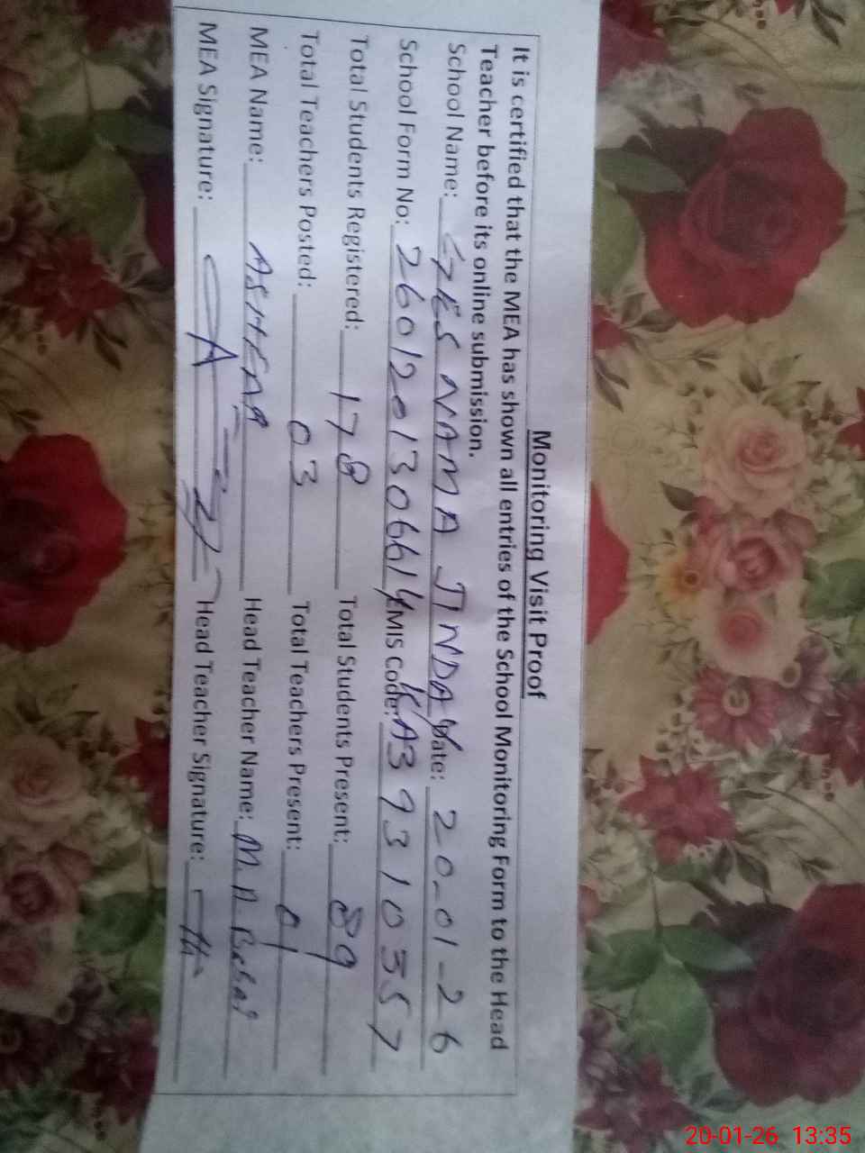 | Attendance Register | Head Teacher | MEA with School | Visit Proof |