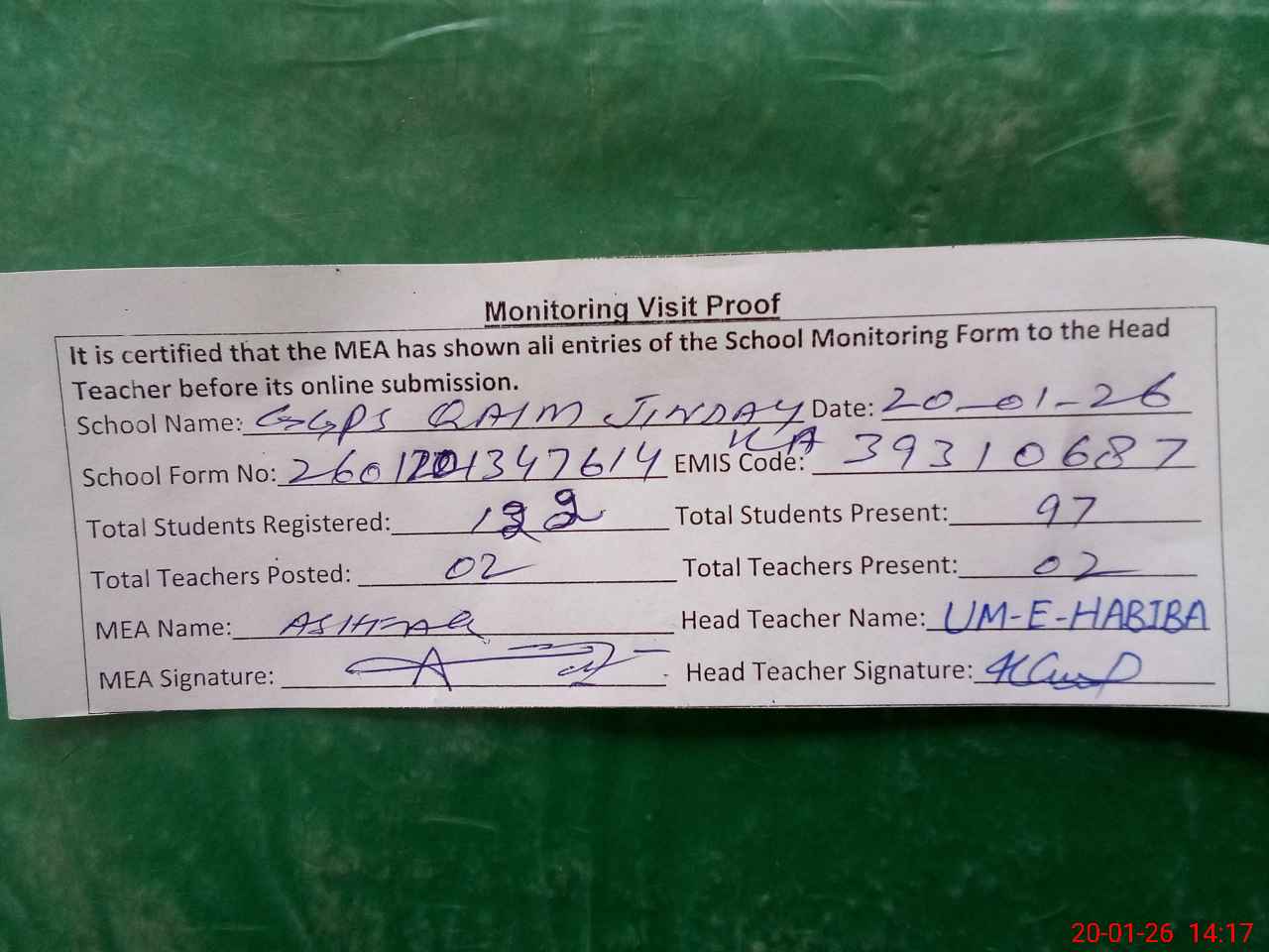 | Attendance Register | Head Teacher | MEA with School | Visit Proof |