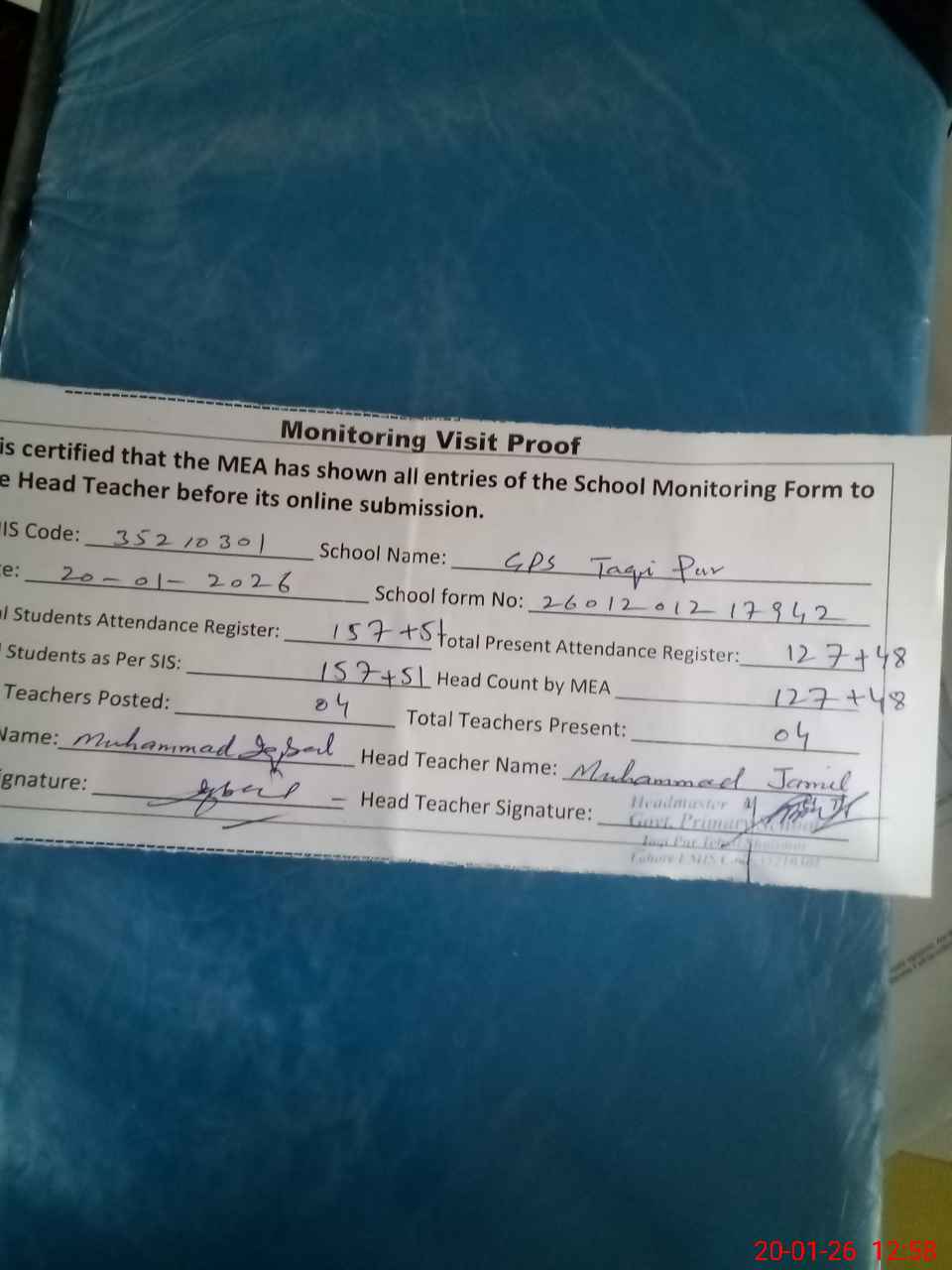 | Attendance Register | Head Teacher | MEA with School | Visit Proof |