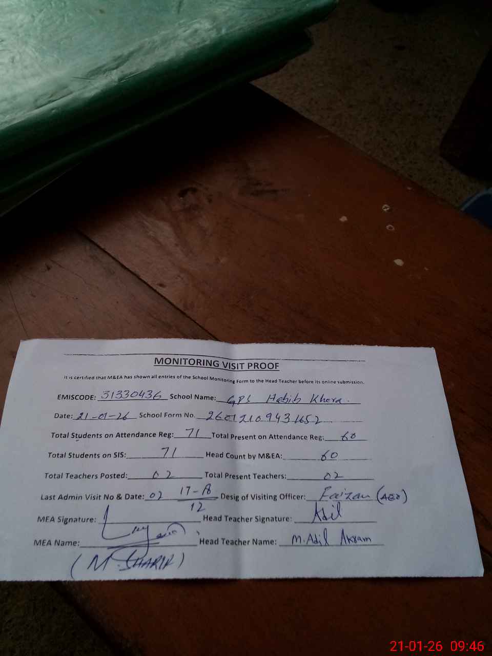| Attendance Register | Head Teacher | MEA with School | Visit Proof |