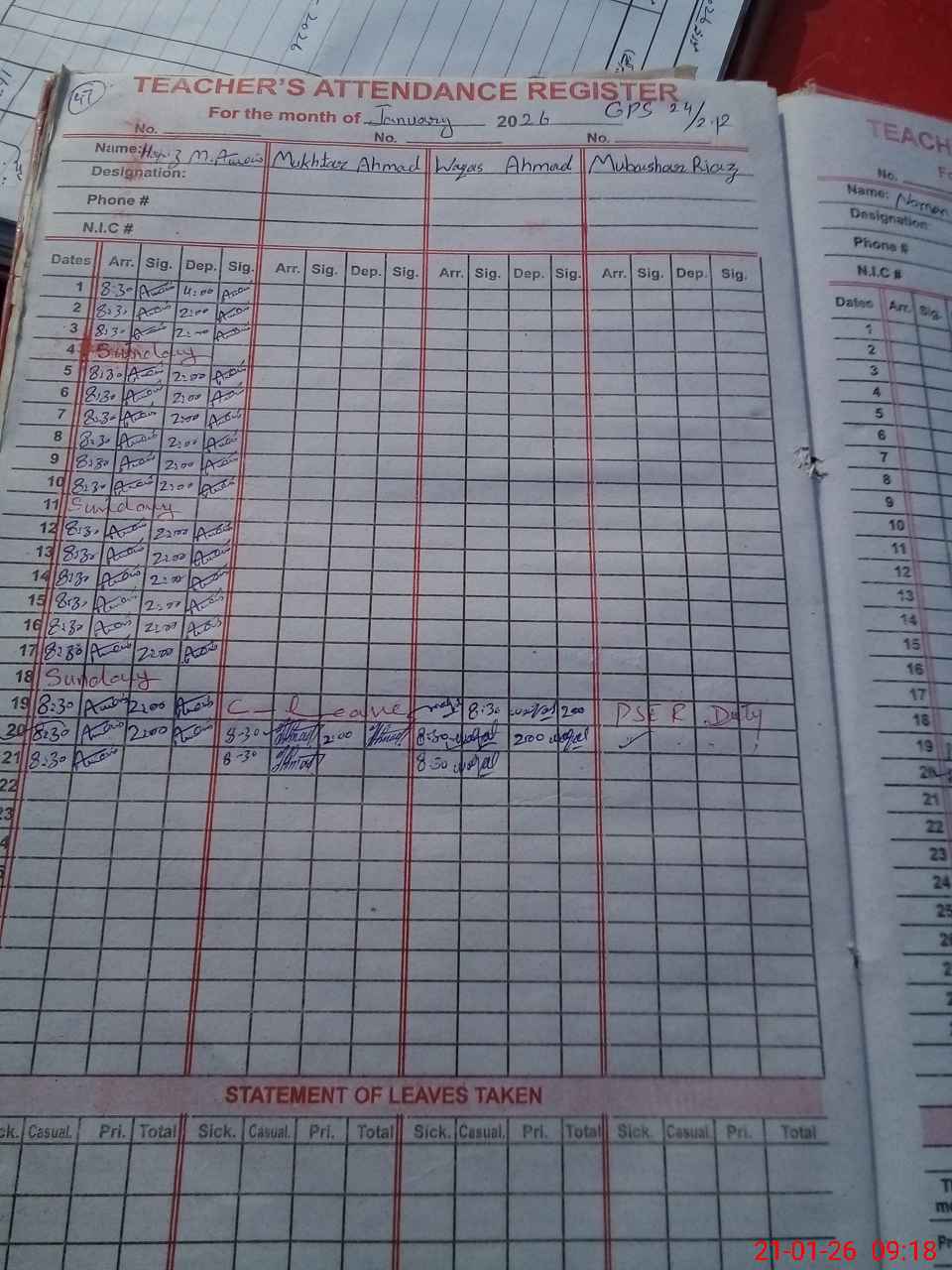 | CNIC | Full Name | Designation | R/C | Absence During Last Calender Month |