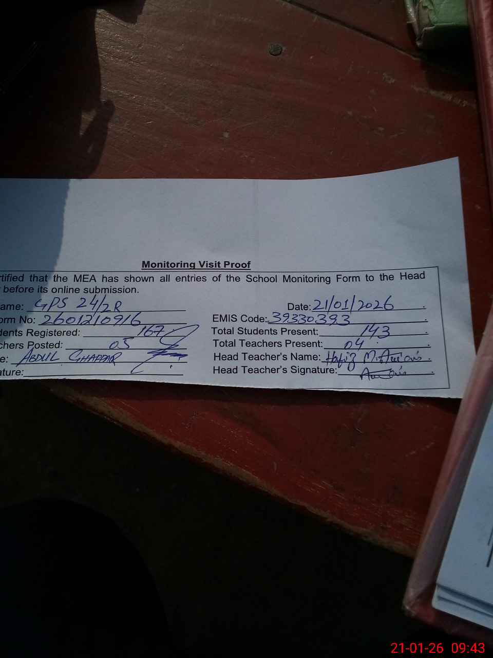 | Attendance Register | Head Teacher | MEA with School | Visit Proof |