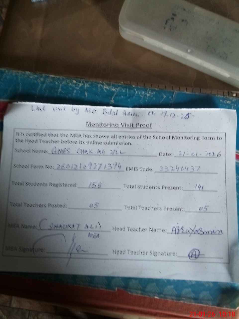 | Attendance Register | Head Teacher | MEA with School | Visit Proof |