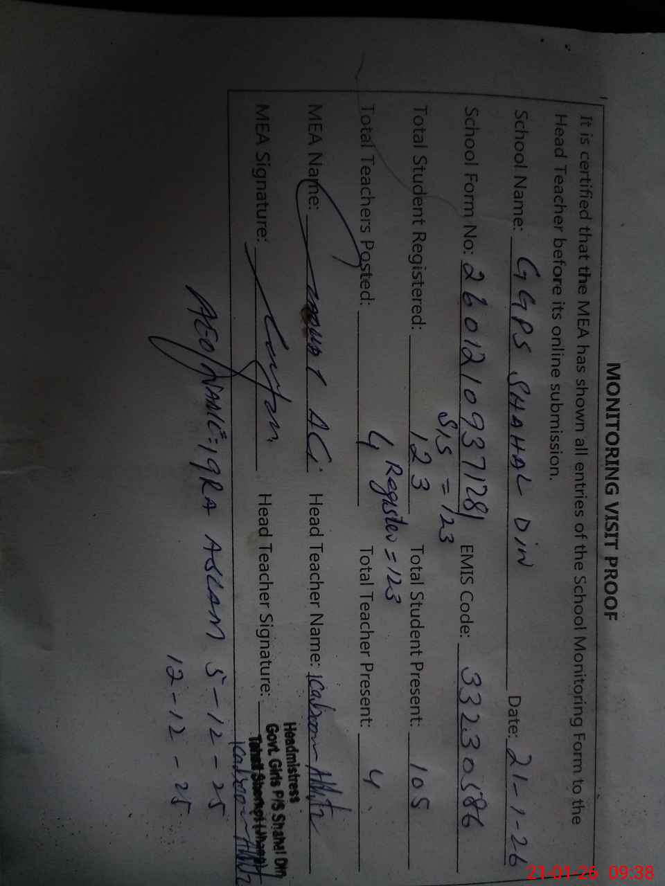 | Attendance Register | Head Teacher | MEA with School | Visit Proof |