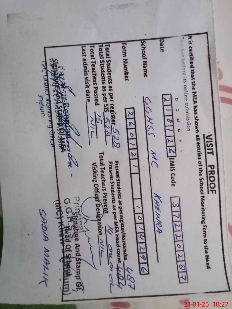 | Attendance Register | Head Teacher | MEA with School | Visit Proof |