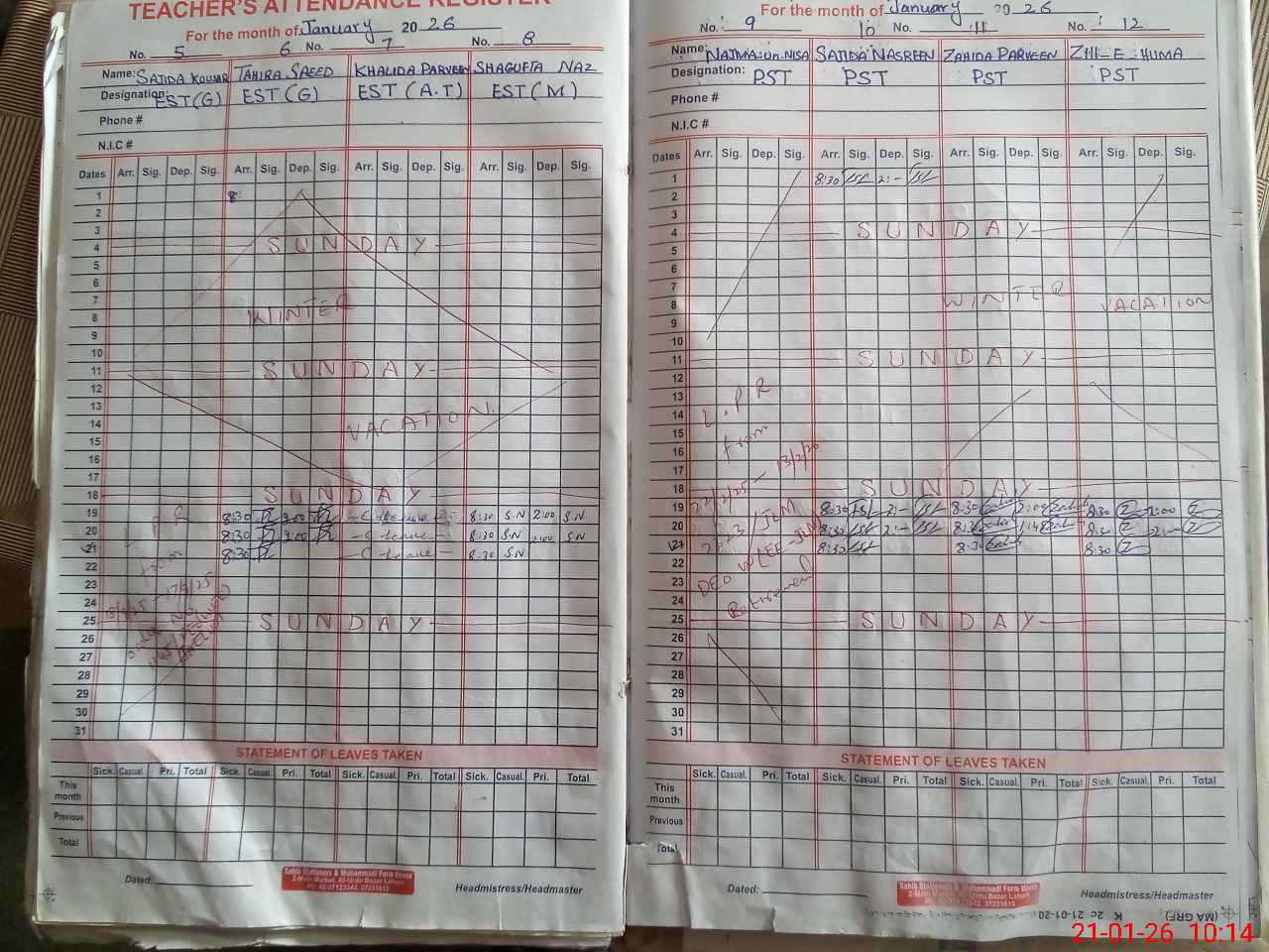 | CNIC | Full Name | Designation | R/C | Absence During Last Calender Month |