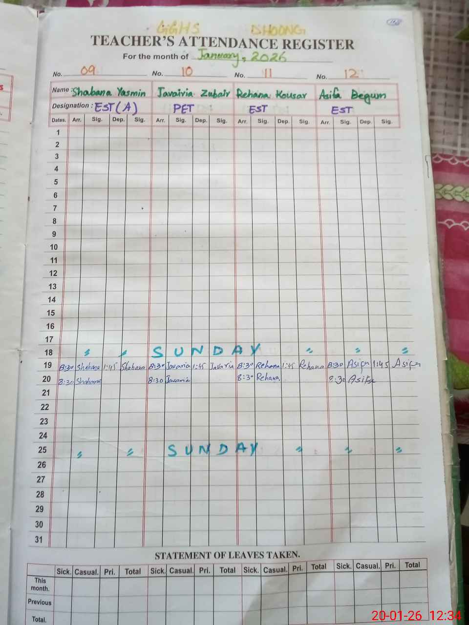 | No. of Students Present - Female | 0 | 18 | 16 | 25 | 20 | 15 | 25 | 26 | 37 | 24 | 35 | 32 | 288 | |||
