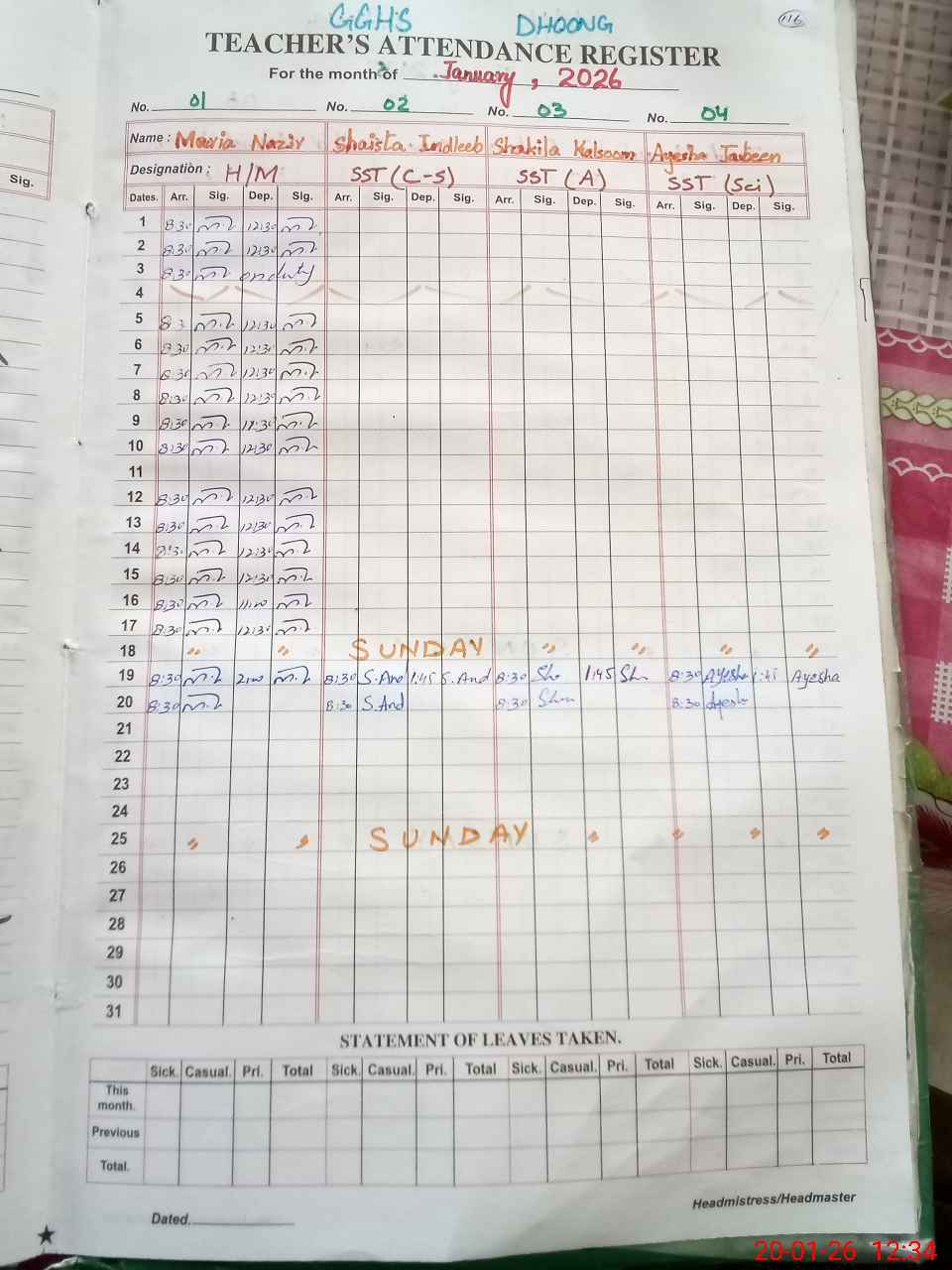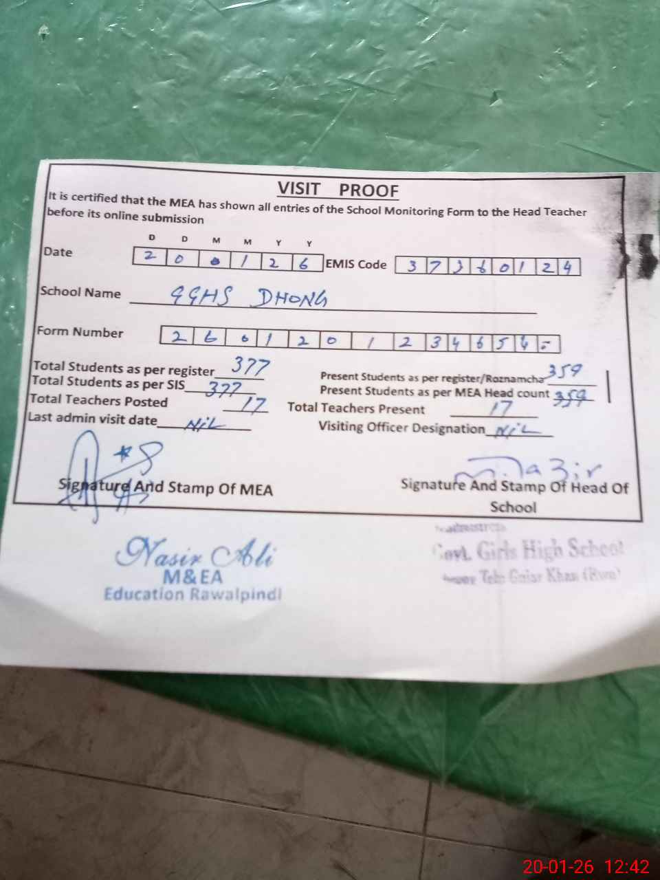 | Attendance Register | Head Teacher | MEA with School | Visit Proof |