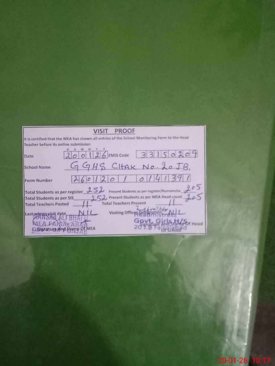 | EMIS Code: 33150209 | Name of School: GGHS CHAK NO. 20 JB | |||