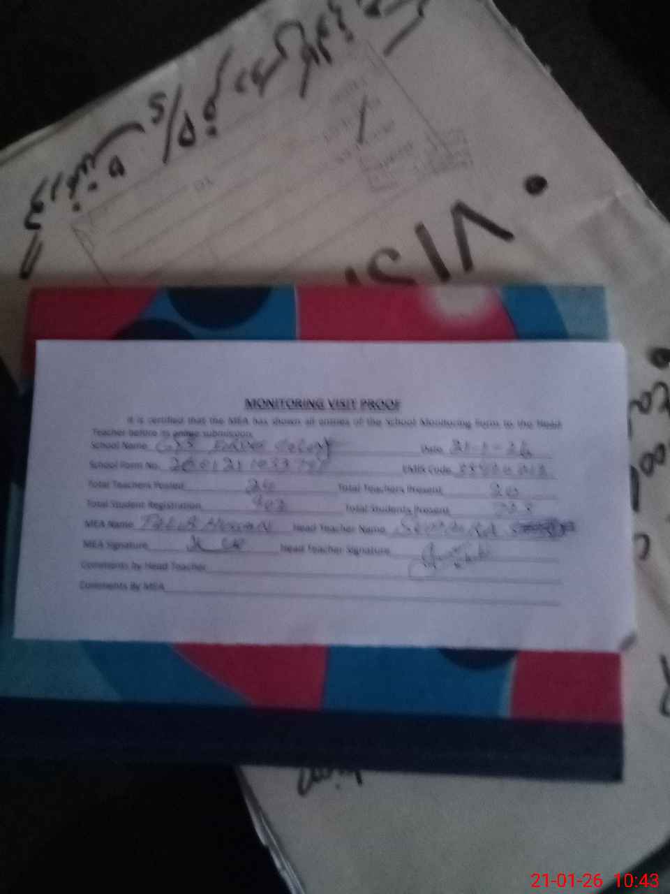 | Attendance Register | Head Teacher | MEA with School | Visit Proof |