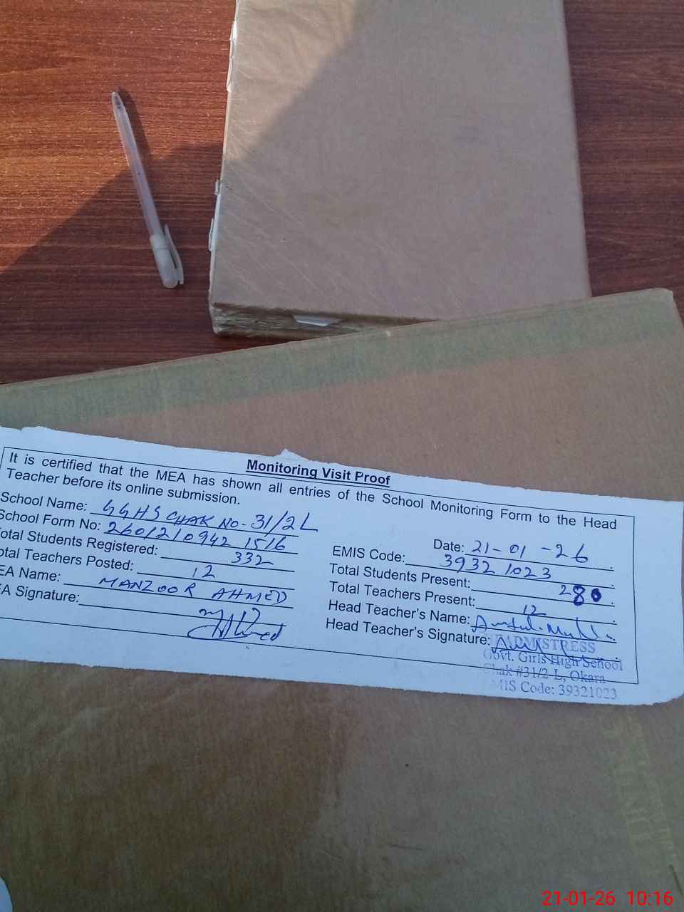 | Attendance Register | Head Teacher | MEA with School | Visit Proof |