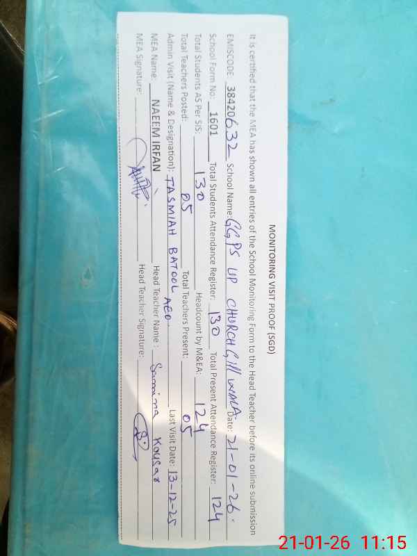 | EMIS Code: 38420632 | Name of School: GGPS U.P CHURCH GILL WALA | |||