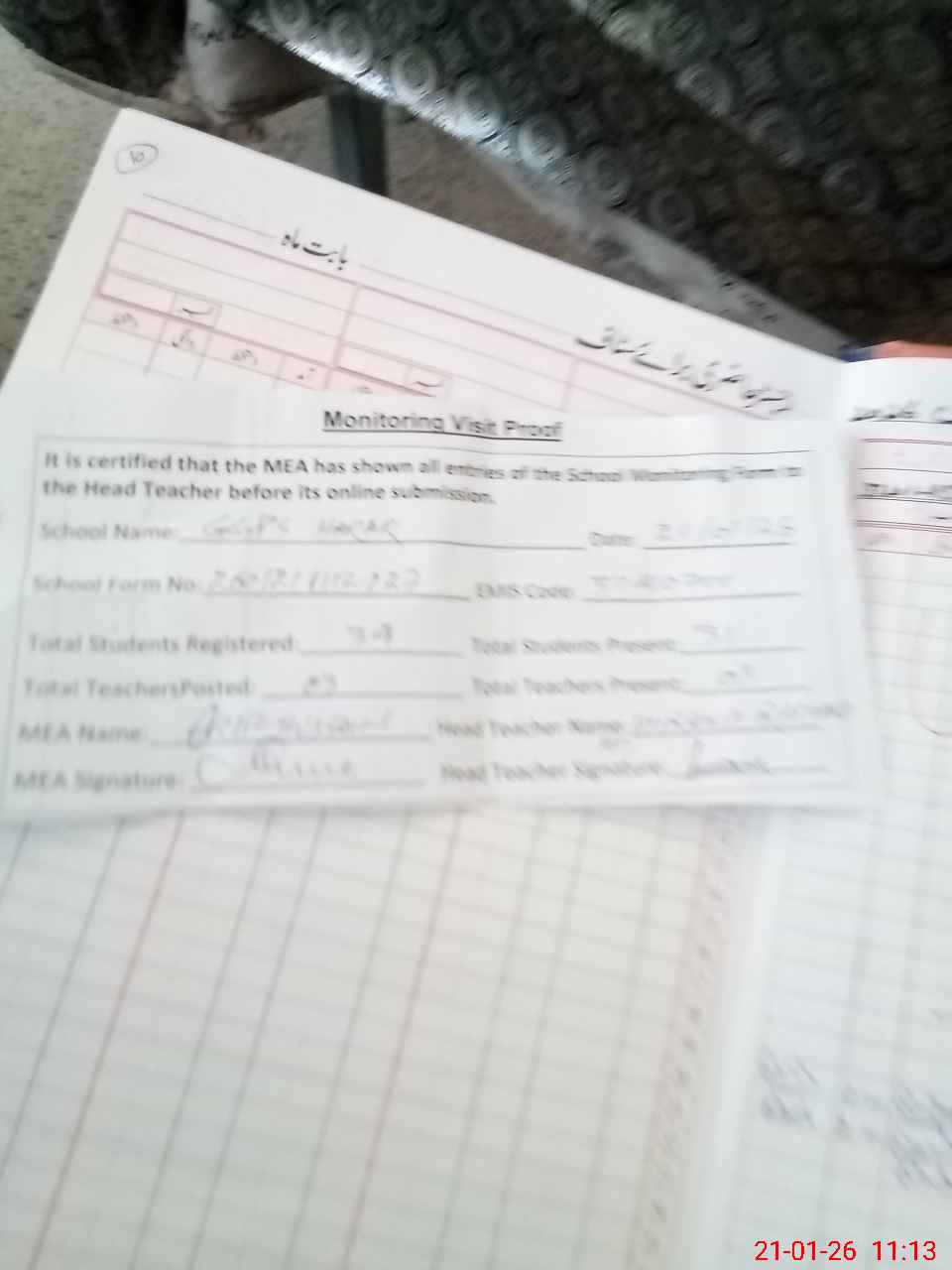 | Attendance Register | Head Teacher | MEA with School | Visit Proof |