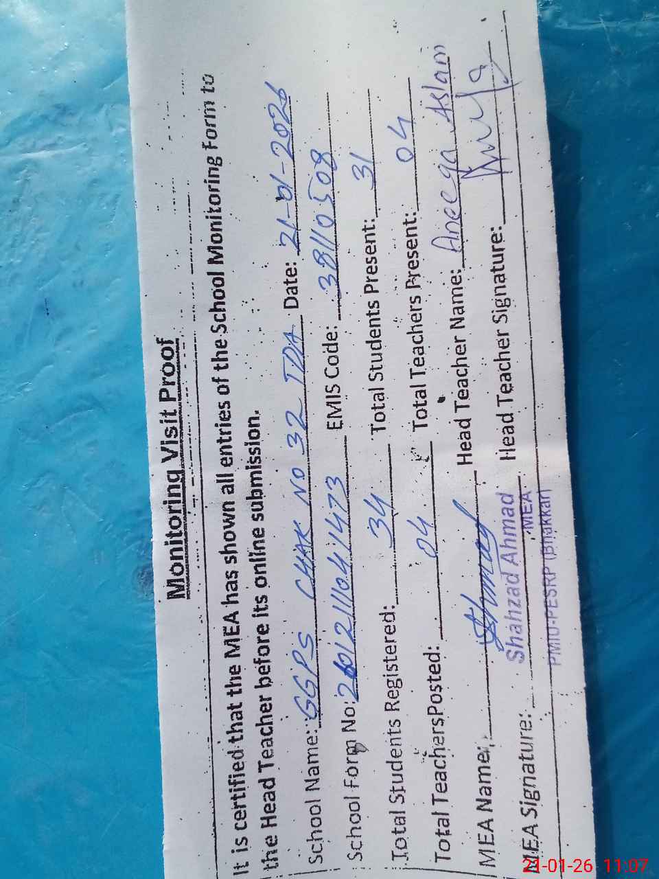 | Attendance Register | Head Teacher | MEA with School | Visit Proof |