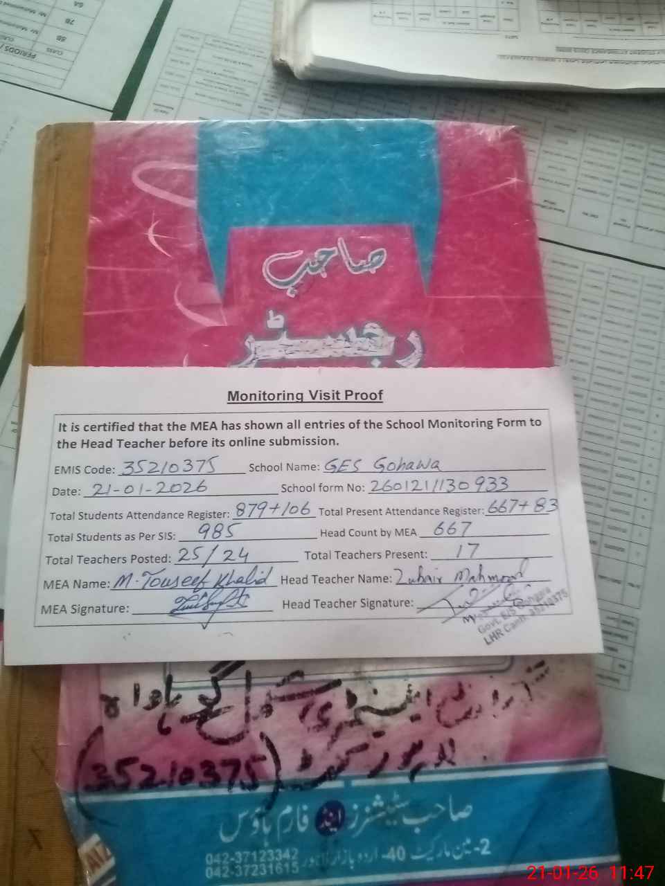 | Remarks (Use Separate Page if Required): Cleanliness level of this school was not up to the mark In this school 2nd floor 11 classrooms are non functional due to contractor did not complete his work and shown as under construction and work stopped since 2018 due to financial issue and also not handed over to the school PST Zunaira Farooq absent since 14 November 2025 till to date PST Abdullah manzoor absent since 25 September 2024 and his removal from service action taken wef 22 October 2025 but his name is still shown on SIS and PMIU application so I marked him absent | |||||