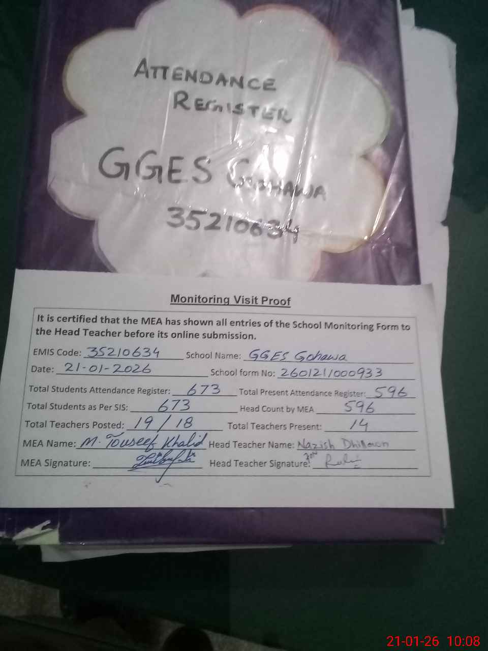 | Attendance Register | Head Teacher | MEA with School | Visit Proof |