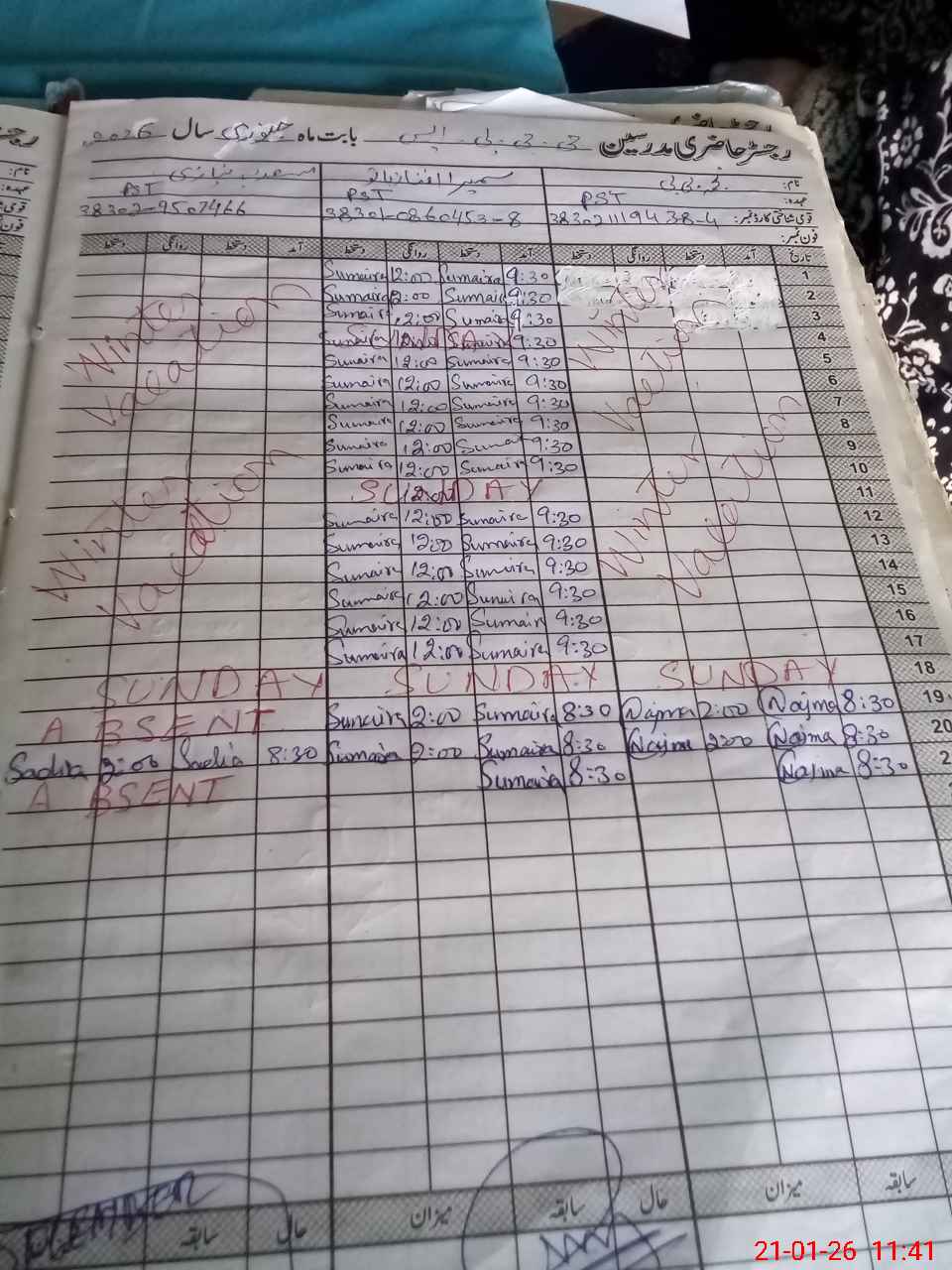 | CNIC | Full Name | Designation | R/C | Absence During Last Calender Month |