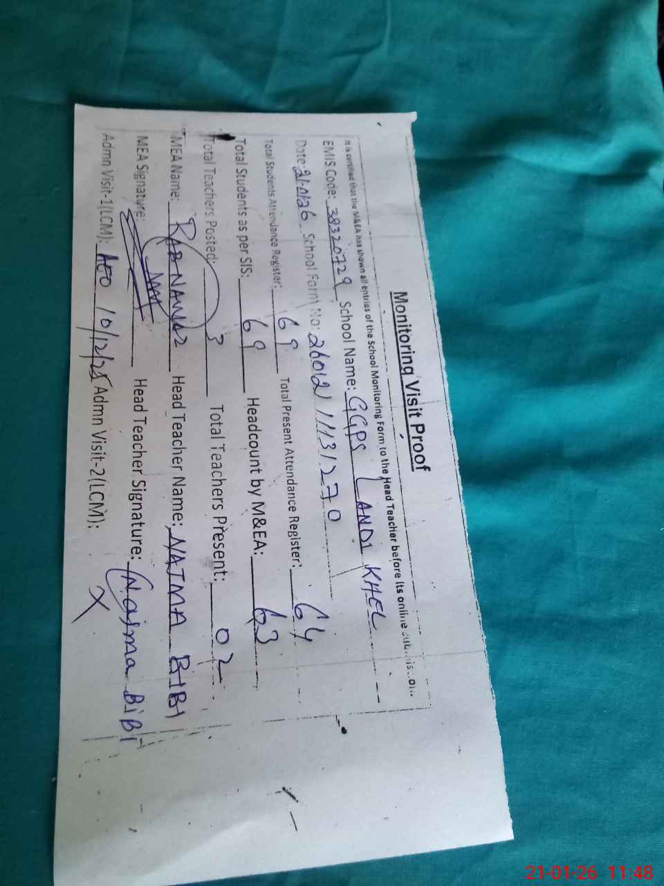 | Attendance Register | Head Teacher | MEA with School | Visit Proof |