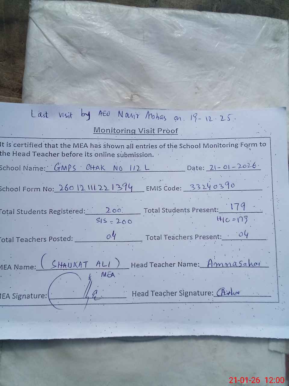 | EMIS Code: 33240390 | Name of School: GMPS CHAK NO 1/2 L | |||