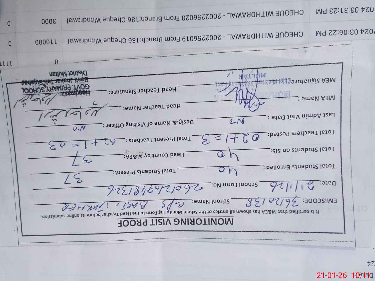 | Certified that this School was Inspected by the Undersigned MEA/DMO Today and the Information Stated Above is as Per Record. | |||||