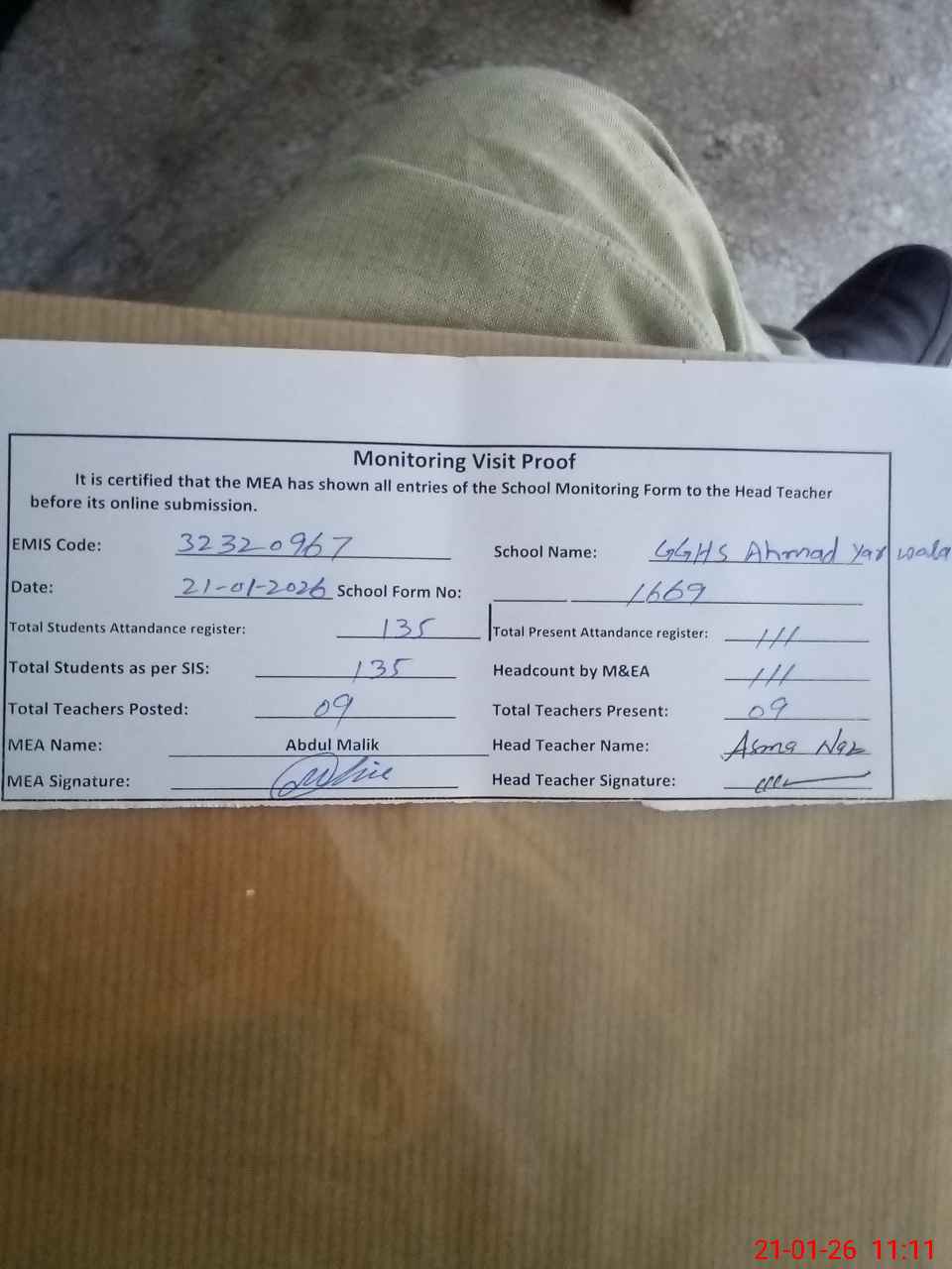 | Attendance Register | Head Teacher | MEA with School | Visit Proof |