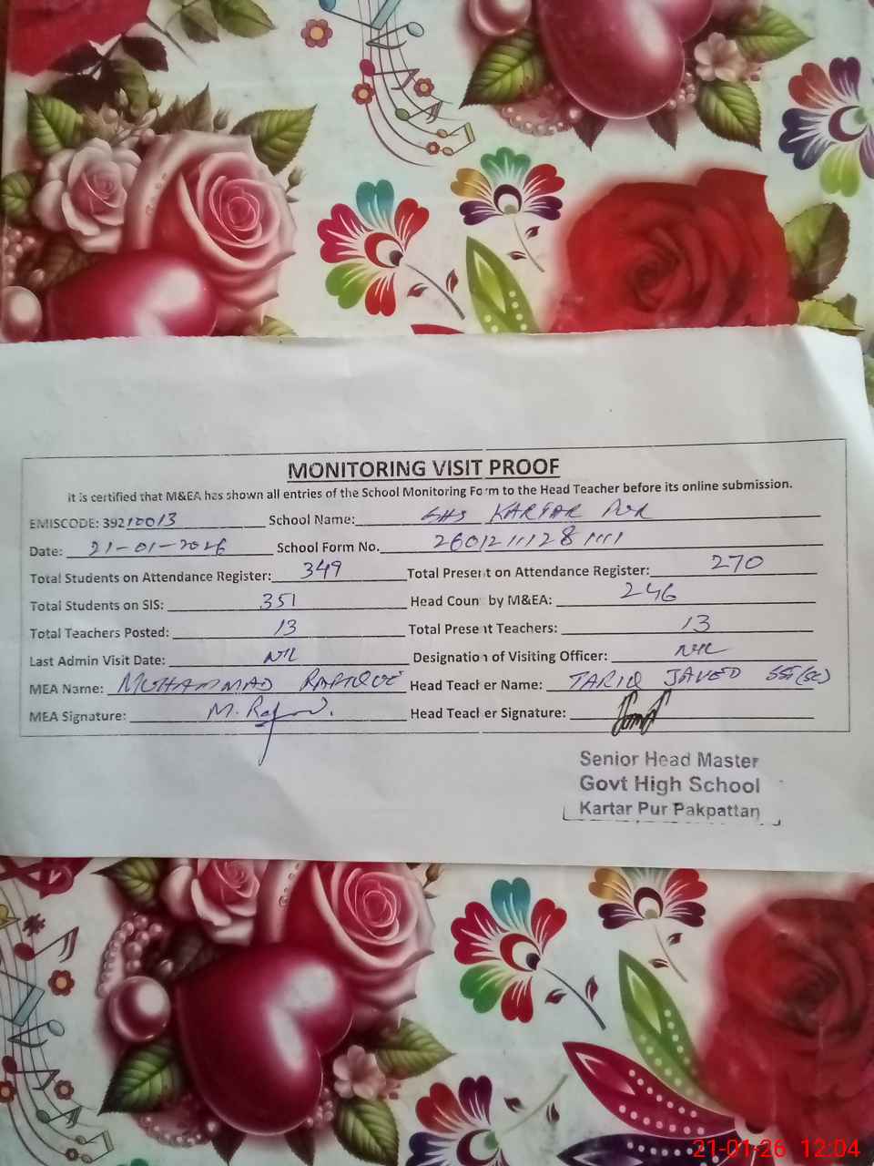 | EMIS Code: 39210013 | Name of School: GHS KARTAR PUR | |||