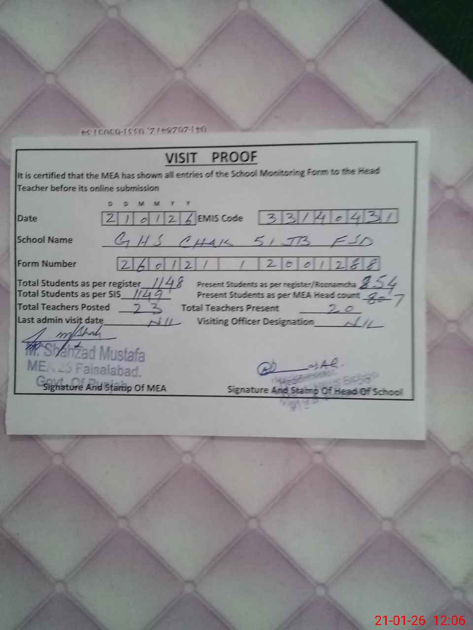 | Attendance Register | Head Teacher | MEA with School | Visit Proof |