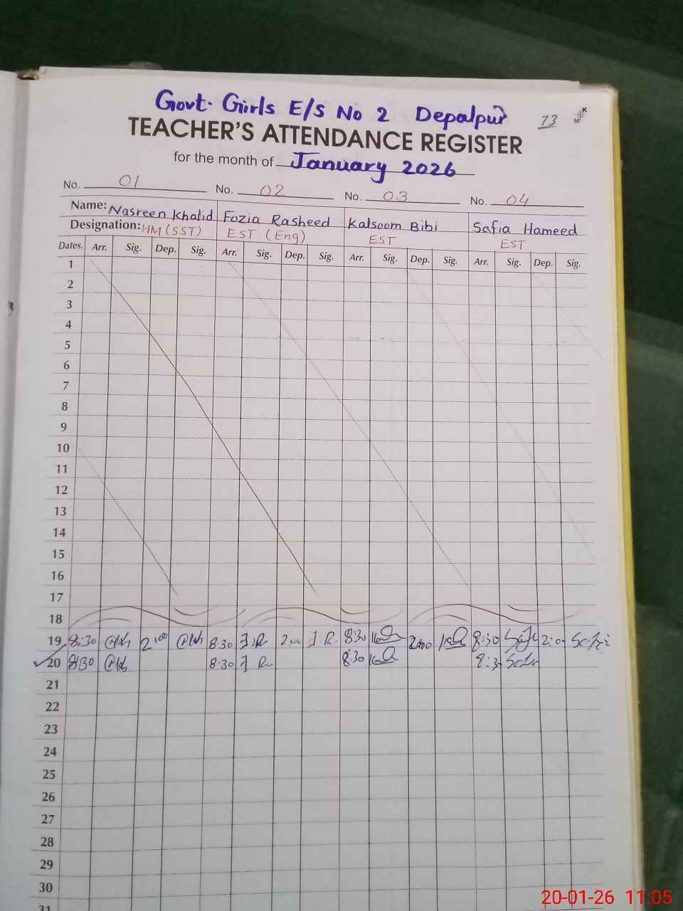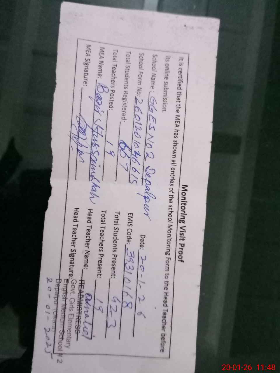 | Attendance Register | Head Teacher | MEA with School | Visit Proof |