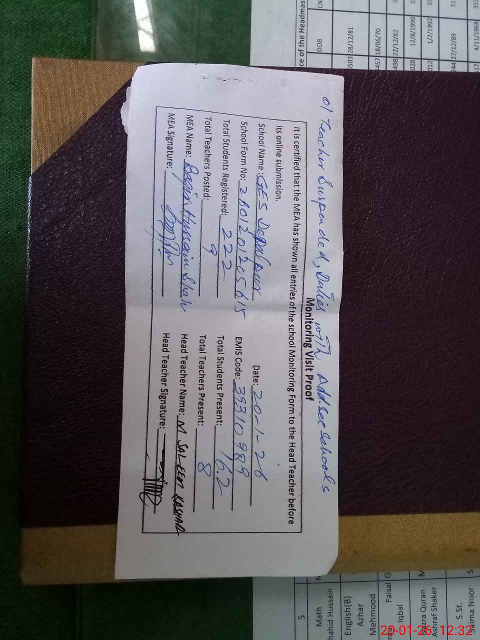 | Attendance Register | Head Teacher | MEA with School | Visit Proof |