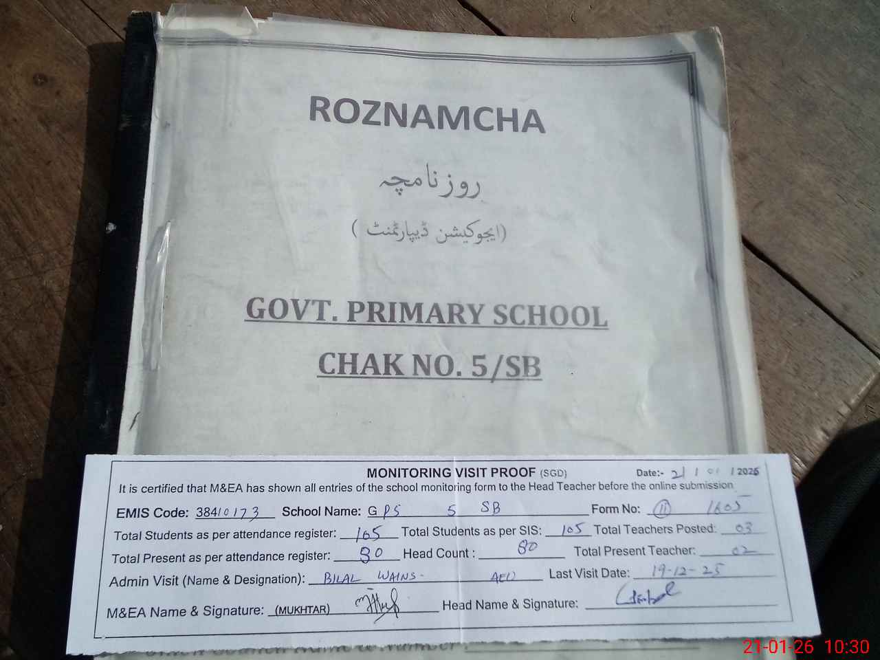 | EMIS Code: 38410173 | Name of School: GPS CHAK NO.5 SB | |||